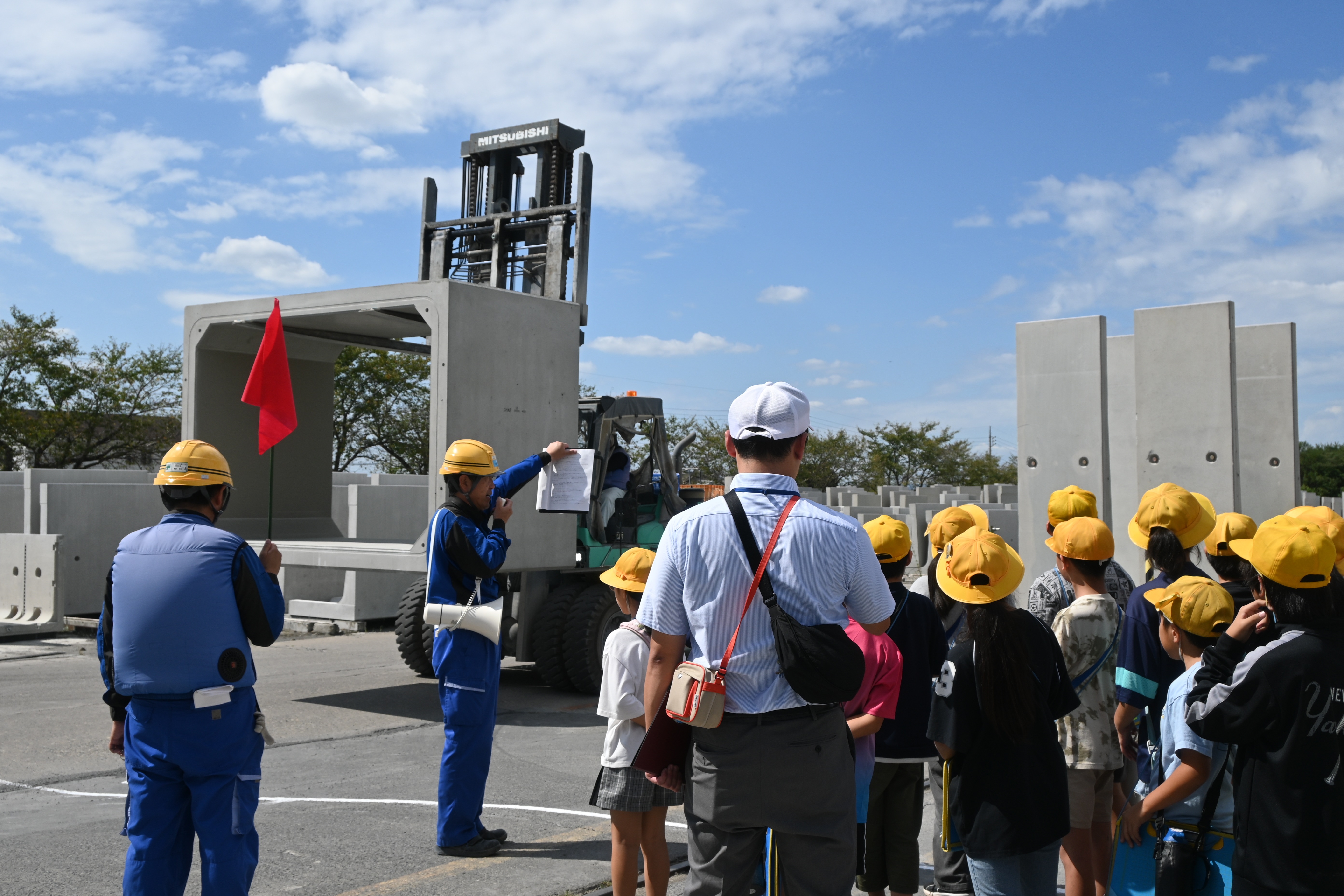 見学では、ベルテクス株式会社の主力製品である「雨水調整池」と「防火水槽」について、動画や体験的な演出を交えながら説明を行いました。その後、コンクリート二次製品への理解を深めてもらうため、製造工程における各設備の見学や、耐震性ボックスカルバート「SJ-BOX」、電線共同溝「C・C・BOX」、高落差対応組立式マンホール「スパイラルホール」、「L型擁壁」などの実際の製品の見学を行いました。見学の最後には、児童の皆さんから製造方法や製品の用途について活発な質問があり、真剣に学ぶ姿がとても印象的でした。